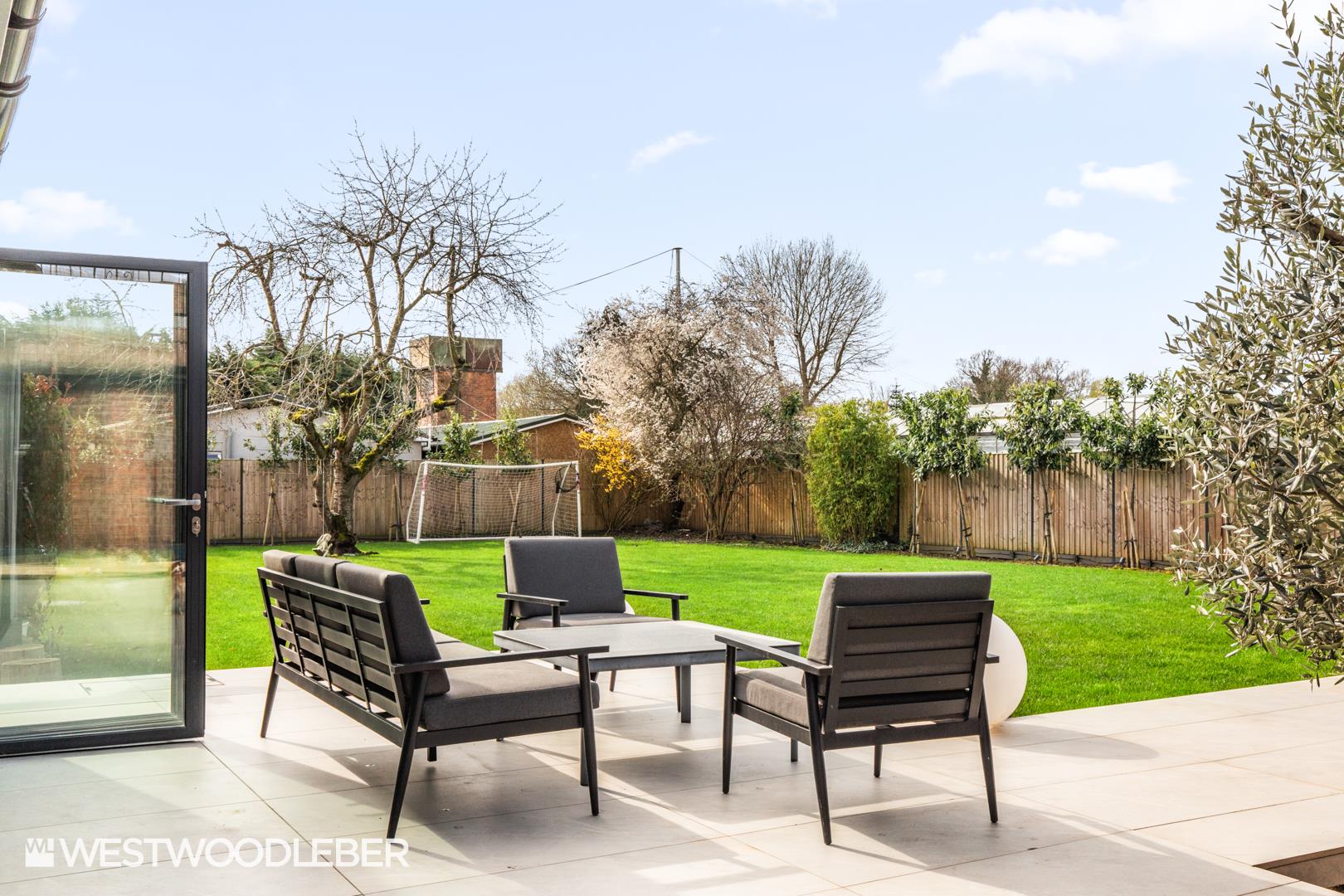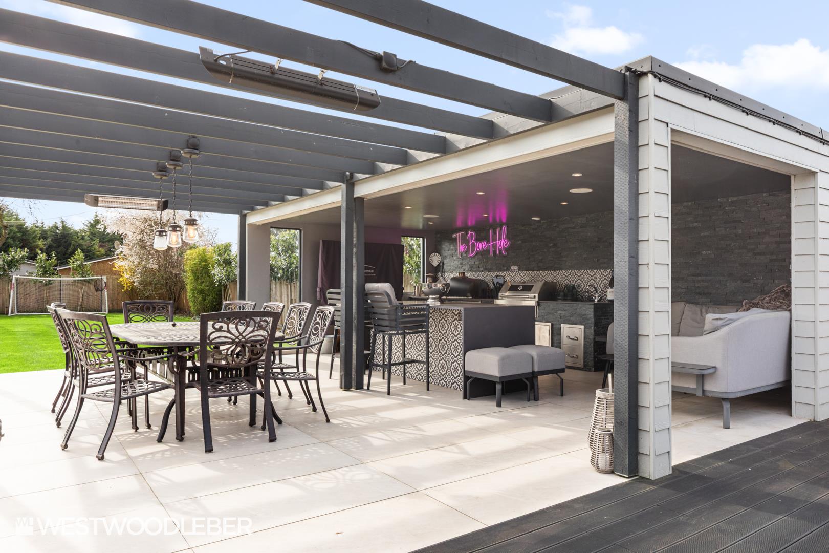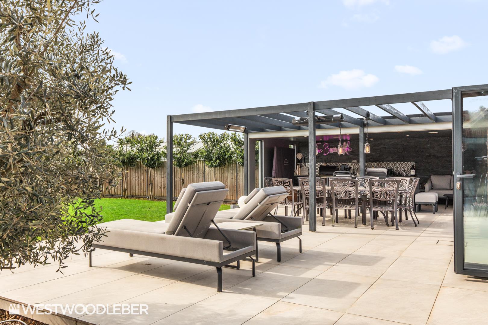 The extensive rear garden has been completely redesigned and landscaped to an exceptional standard, providing a number of distinct areas for relaxing and entertaining. A stylish outdoor kitchen creates the perfect space for al fresco dining, while various seating and entertaining zones allow the garden to be enjoyed throughout the seasons.