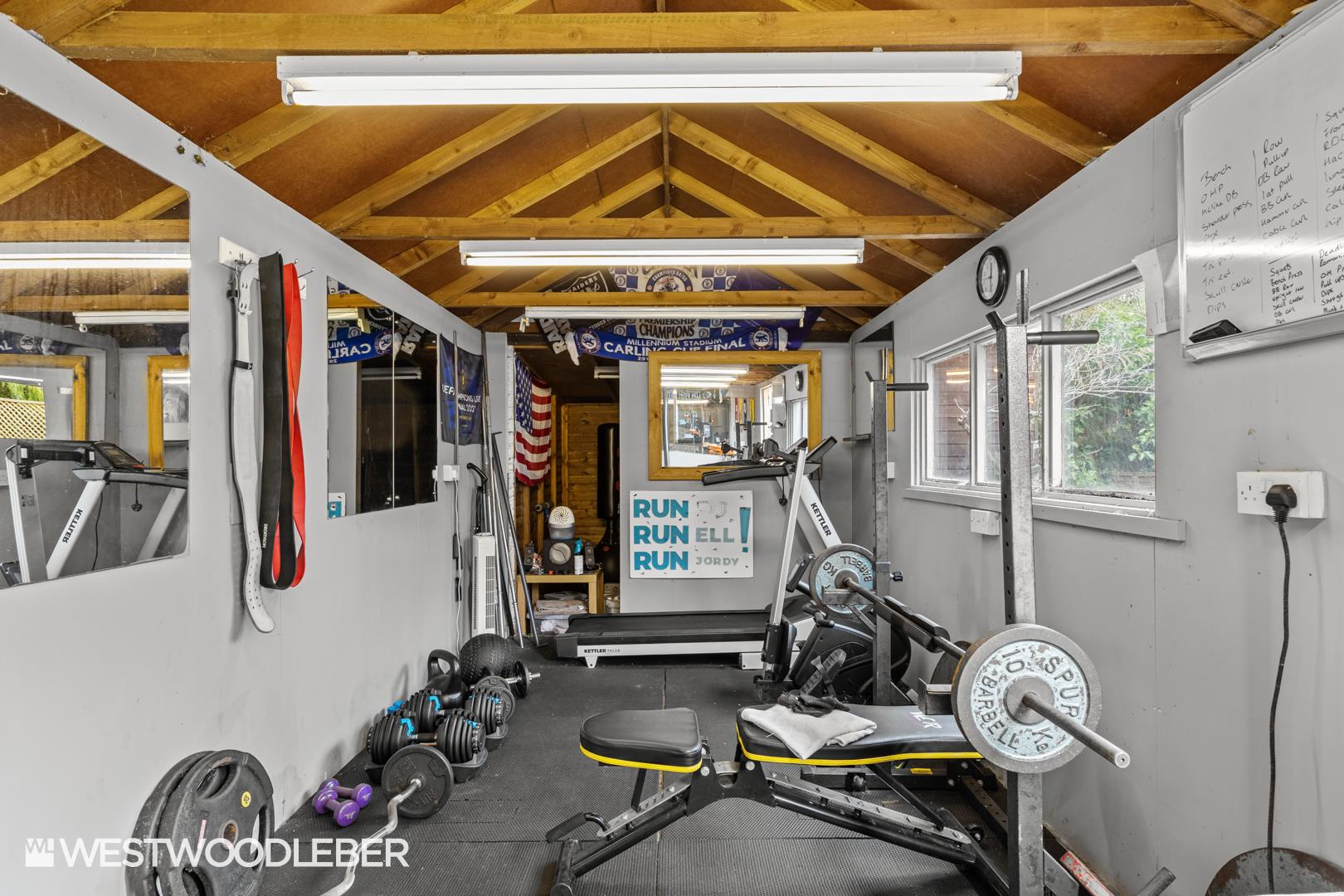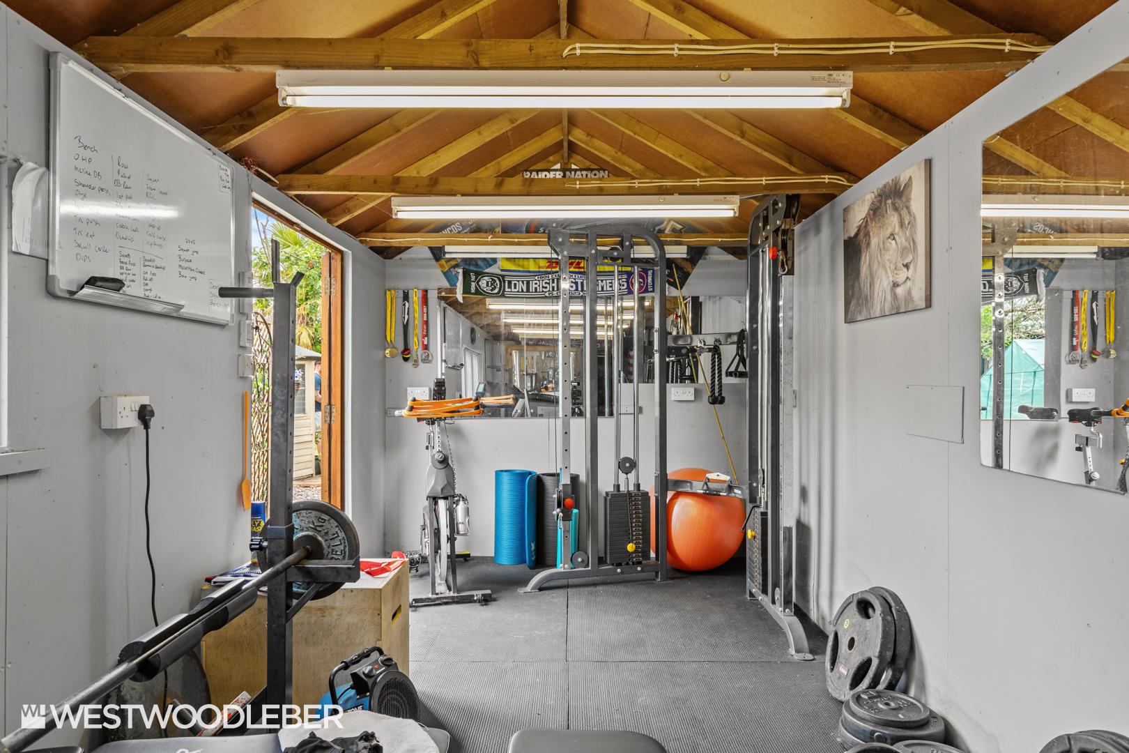 - Substantial driveway, landscaped rear garden, and detached garden cabin currently used as a gym.