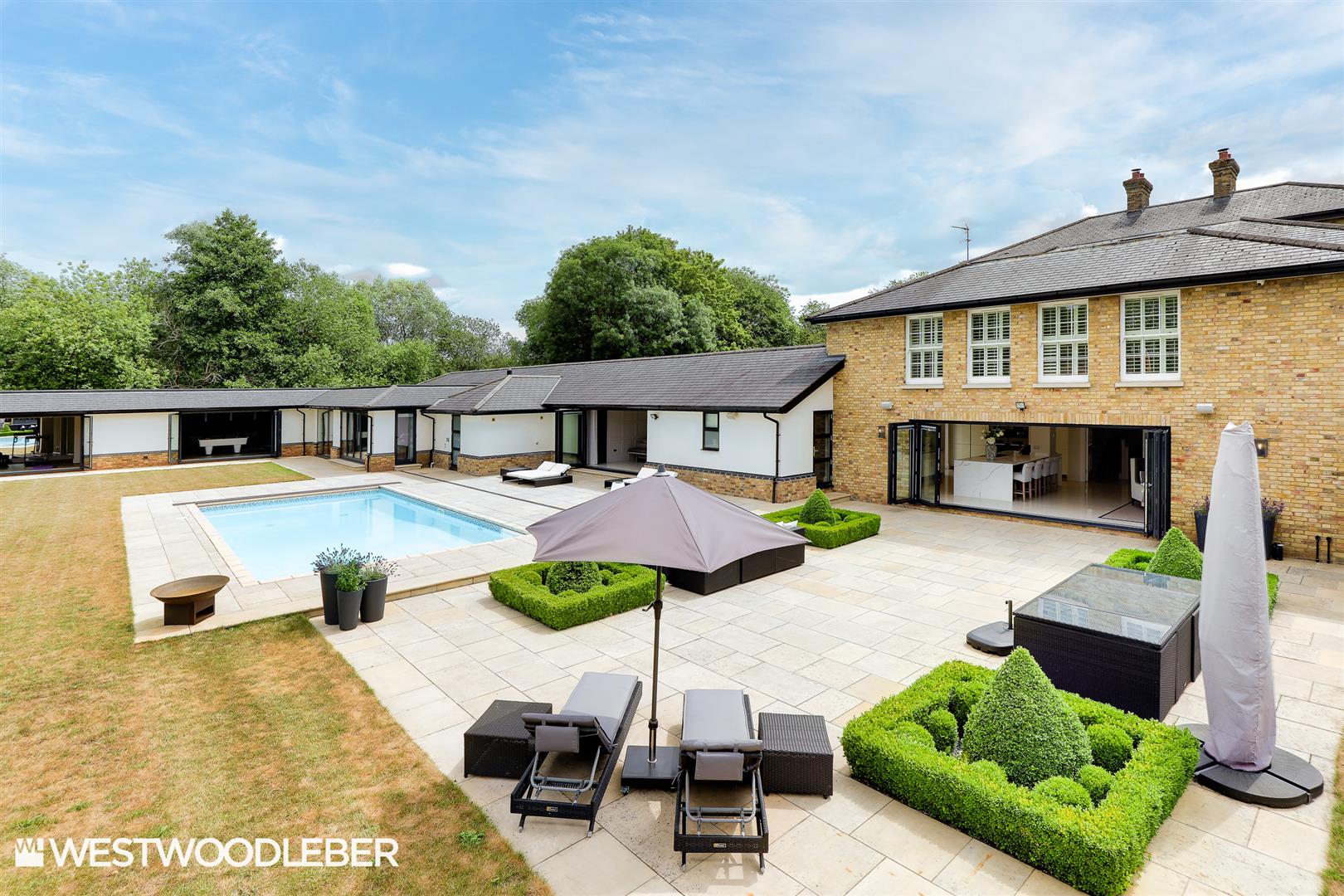 Westwood Leber are delighted to bring to the market Thrifts House, an exceptional contemporary country residence set within three acres of stunning grounds in the sought-after village of Great Amwell. Remodelled and extended to the highest standard, this remarkable home offers over 8,000 sq ft of beautifully designed accommodation combining timeless elegance with modern sophistication.A sweeping carriage driveway with a central fountain leads to a substantial six-car garage with high ceilings and premium motorised doors. Inside, a grand entrance hallway opens to a range of reception rooms including a dining room, sitting room, lounge, and study. The heart of the home is the magnificent kitchen/family room with bi-fold doors leading onto the terrace and landscaped gardens. A charming morning room flows into the bespoke cinema room, while the east wing offers a luxurious gym and games room/bar that can be adapted into a self-contained annexe. Upstairs, the principal suite enjoys a luxury bathroom, large dressing room, and far-reaching views over the parkland and lake. Three further bedrooms and elegant bathrooms complete the first floor, with two additional bedrooms on the lower ground level.The external entertaining space is truly outstanding, featuring a heated swimming pool with automatic cover, and a bespoke vaulted outdoor kitchen with pizza oven. The beautifully landscaped gardens combine parkland, lake views, and modern family space, creating the ultimate setting for entertaining year-round.Located close to Hertford and Ware, with excellent road and rail links to London and a choice of renowned schools, Thrifts House represents a rare opportunity to acquire one of Hertfordshire’s finest country homes — a property that must be seen to be truly appreciated. Viewings are strictly by appointment only.