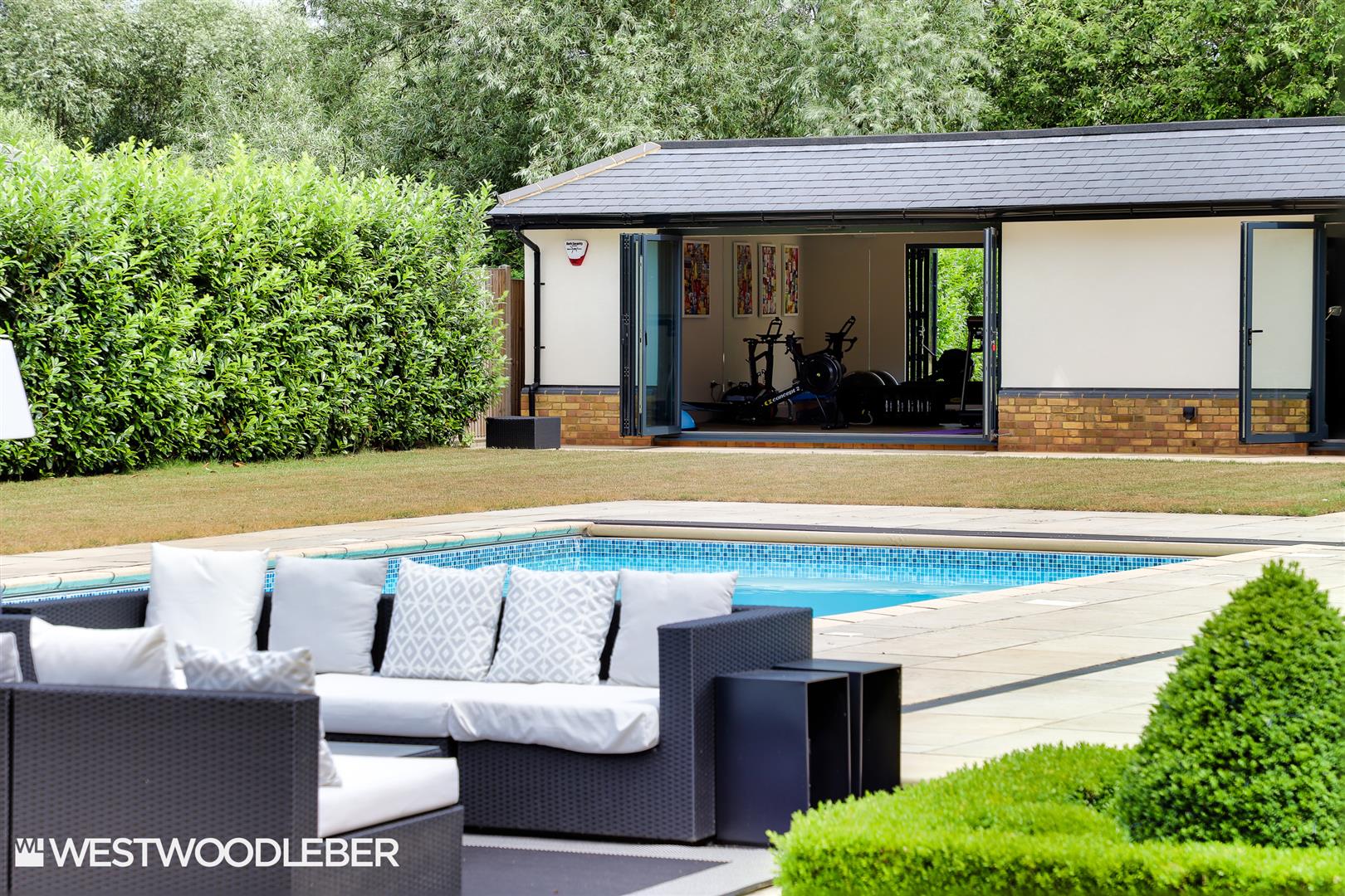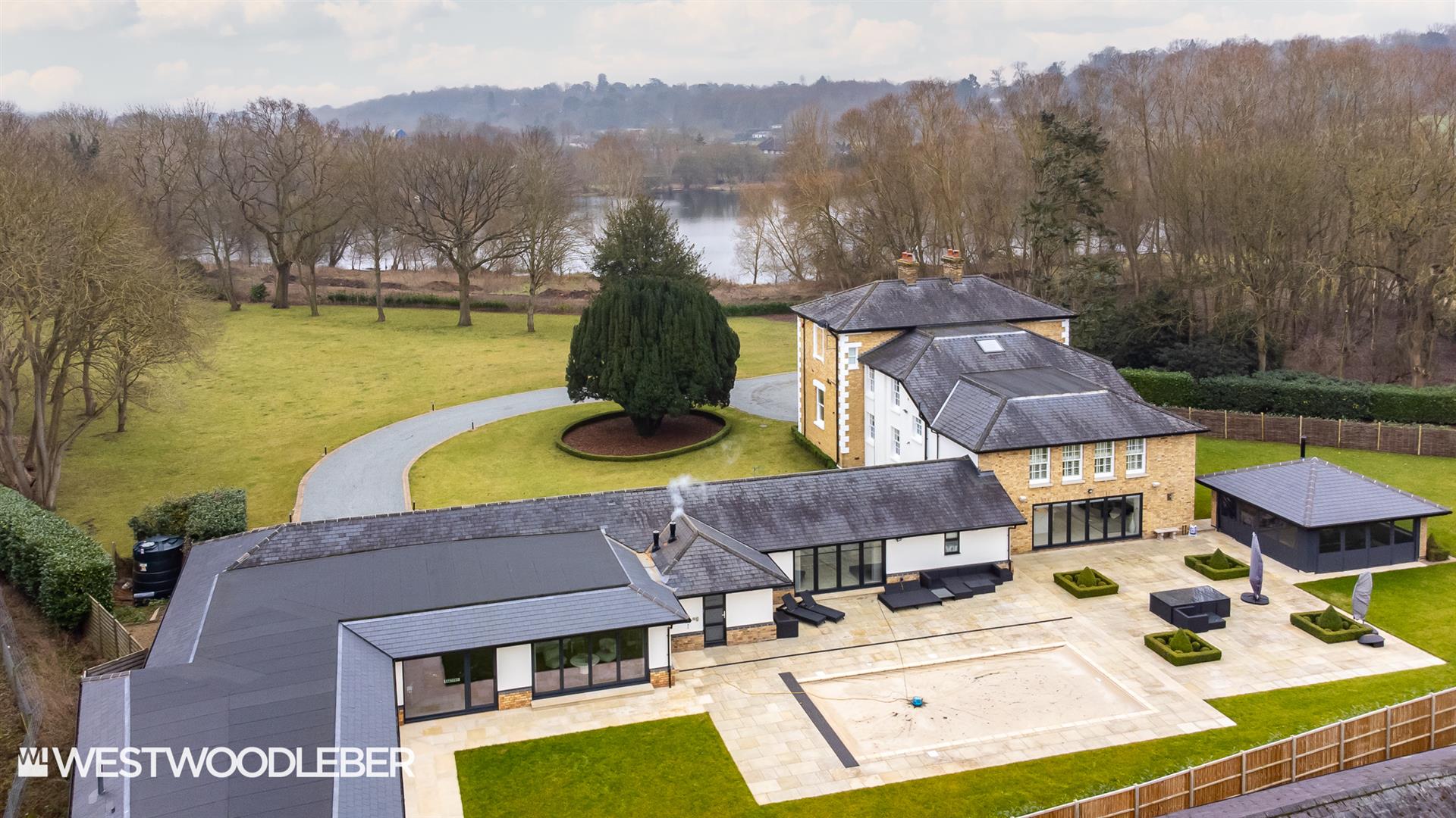 Externally the entertaining space outside is truly fabulous. These three acre grounds combine traditional Parkland with panoramic lake views and private modern landscaped family garden space. This sociable space includes an outdoor heated swimming pool with Coverstar automatic pool cover, positioned next to a detached bespoke outbuilding which incorporates an outdoor kitchen with vaulted ceiling and built in pizza oven. This outdoor space is lead to from all parts of the house helping to create the ultimate entertainment area, perfect for social events come summer or winter.