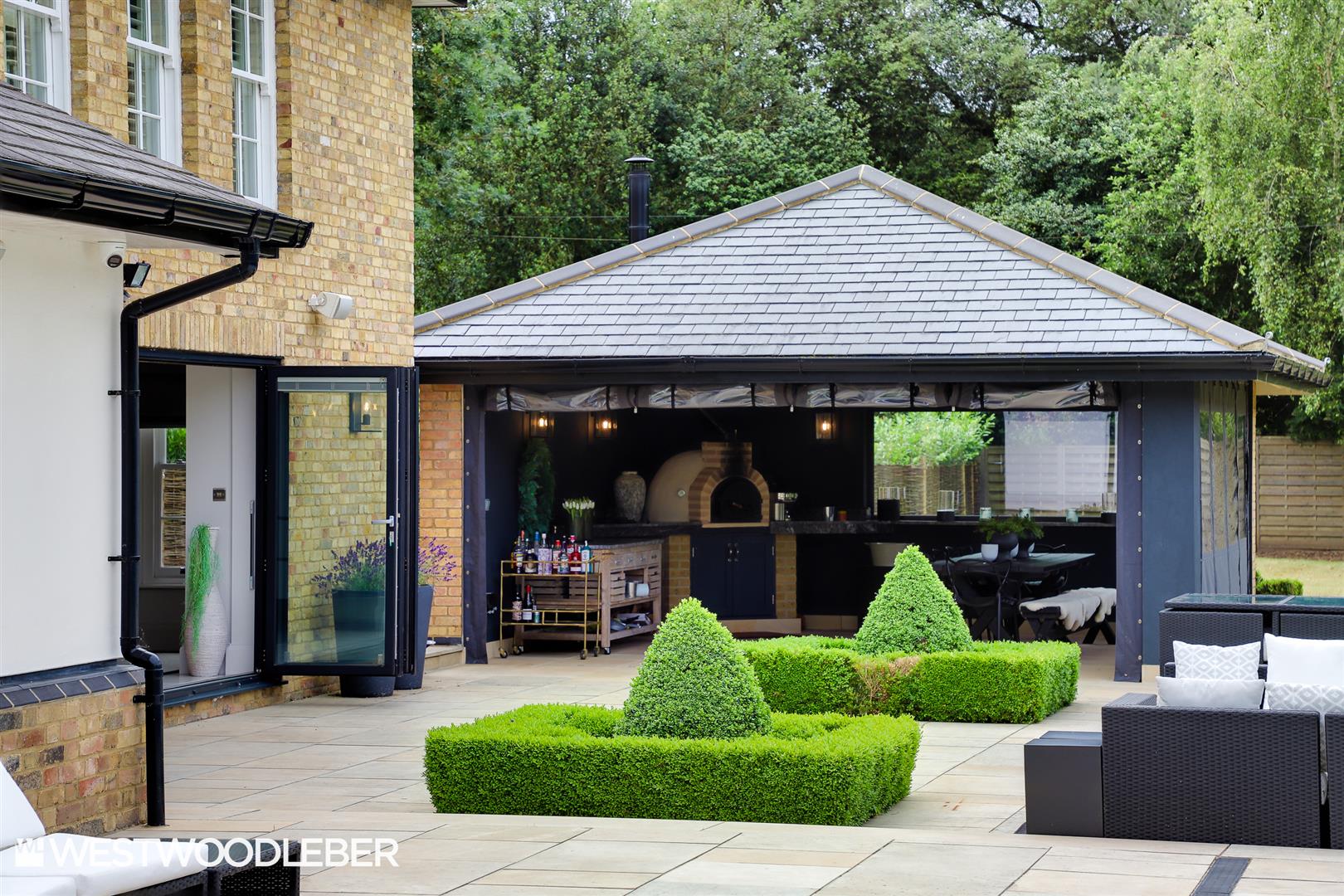 - Bespoke vaulted outdoor kitchen with built-in pizza oven and entertaining area