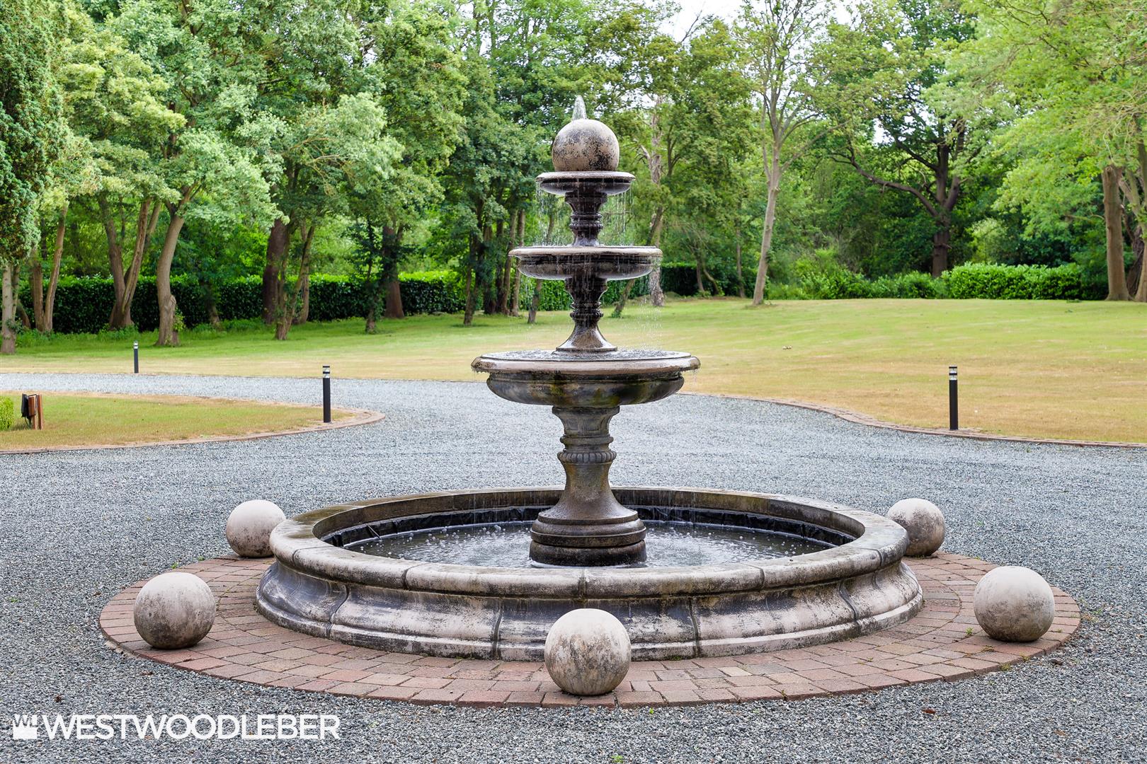 - Sweeping carriage driveway with central fountain and six-car garage