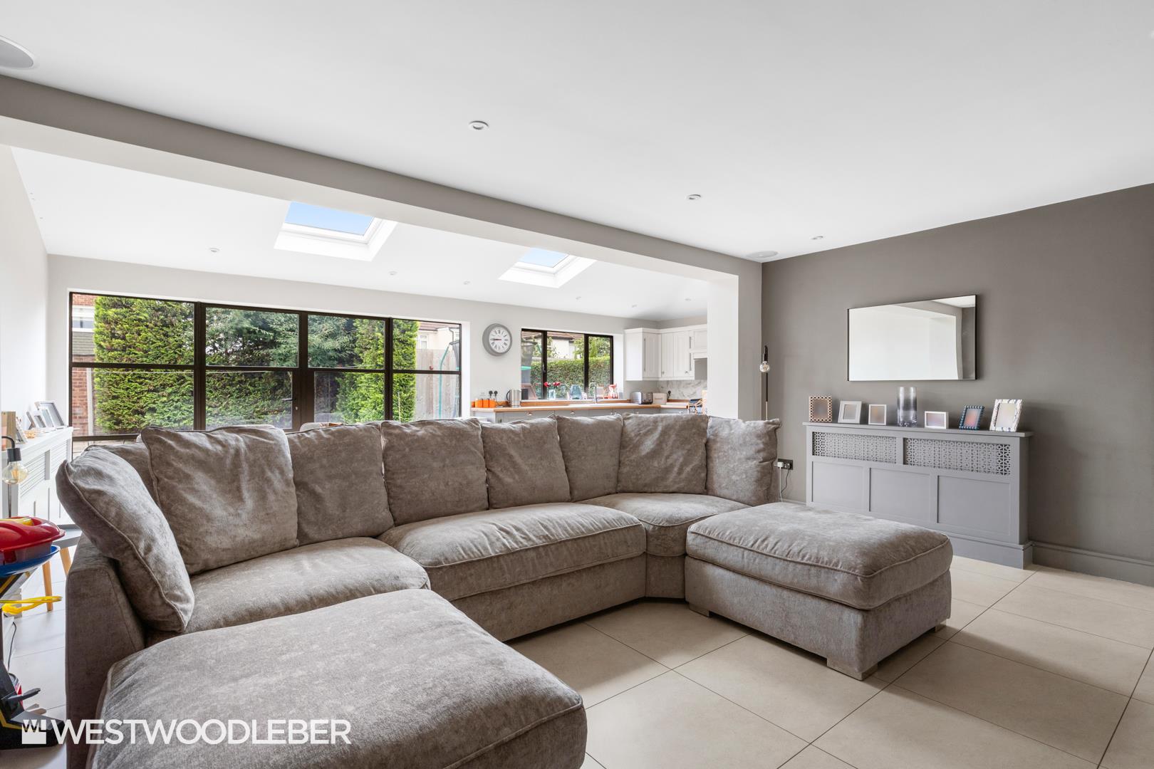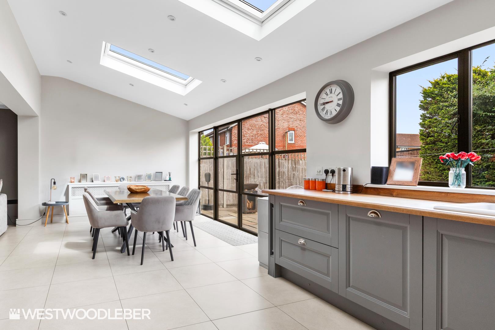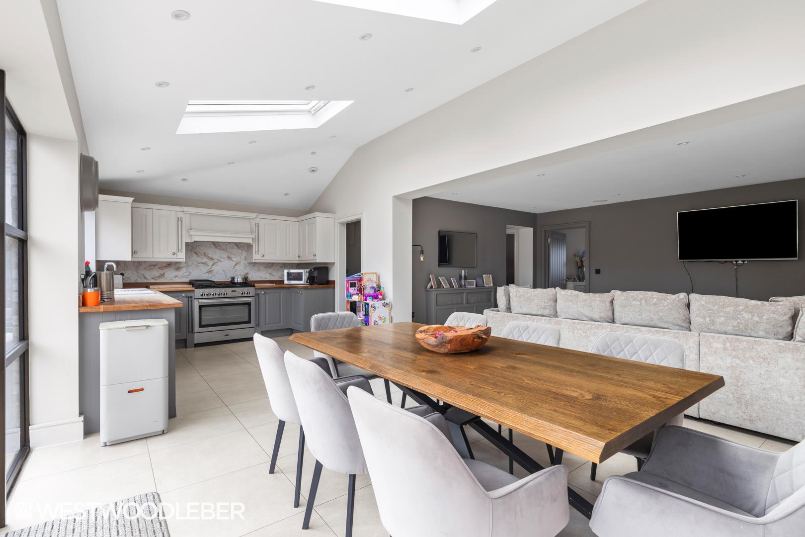 - Stunning open-plan kitchen/dining/living area with skylights.