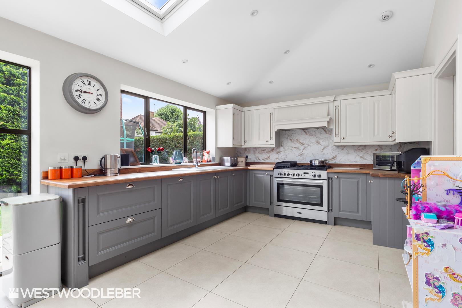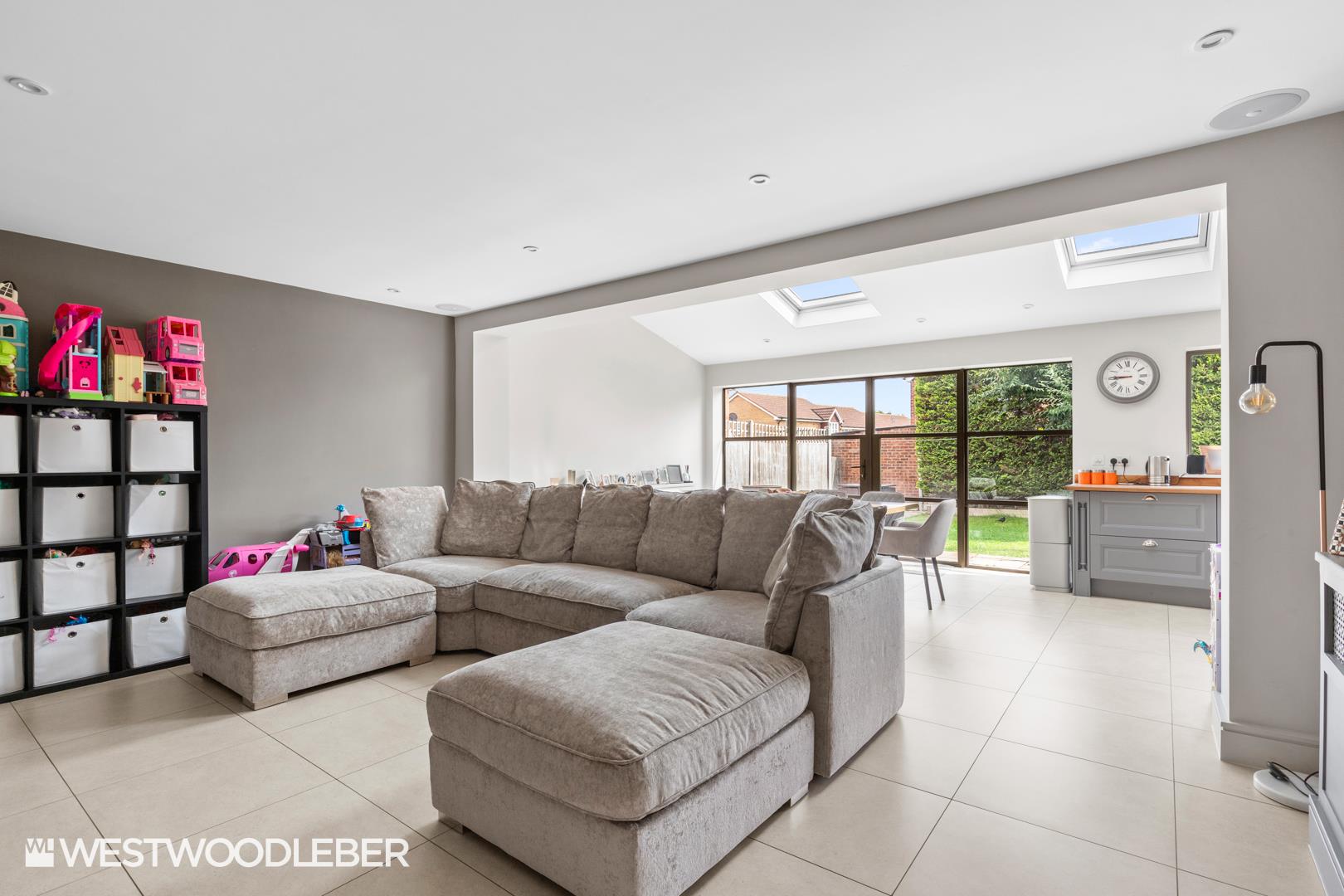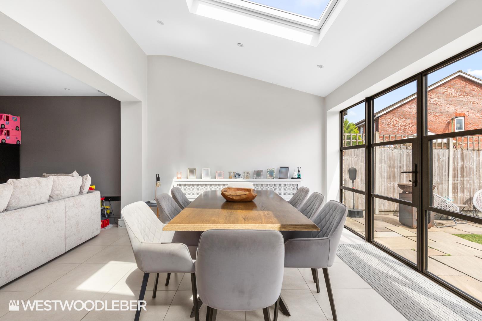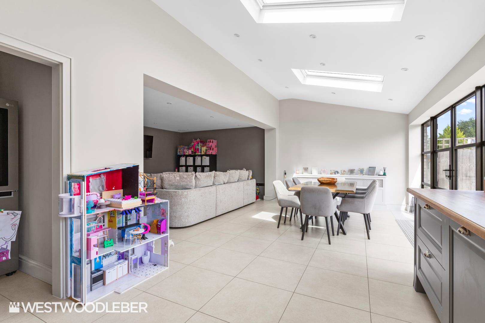 - Stunning open-plan kitchen/dining/living area with skylights.