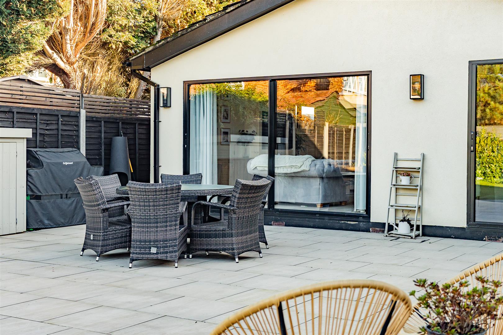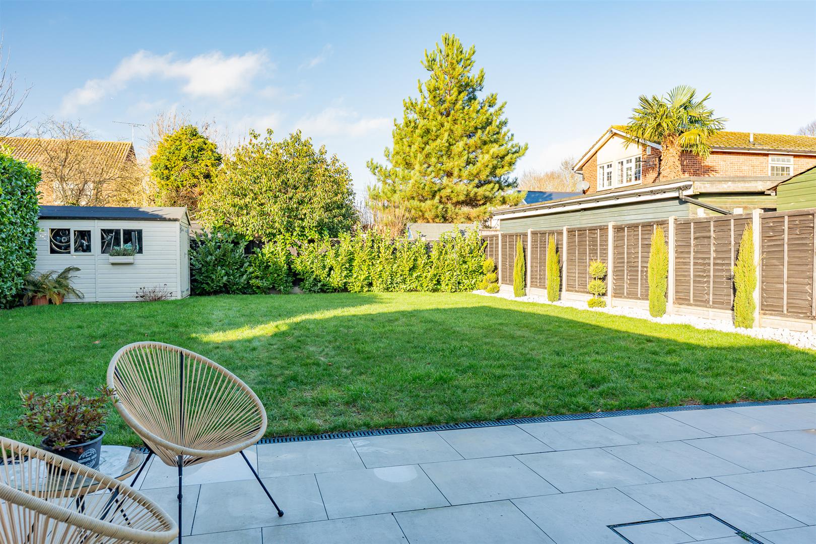 - Beautiful south-facing garden with large patio, ideal for outdoor dining and relaxation.